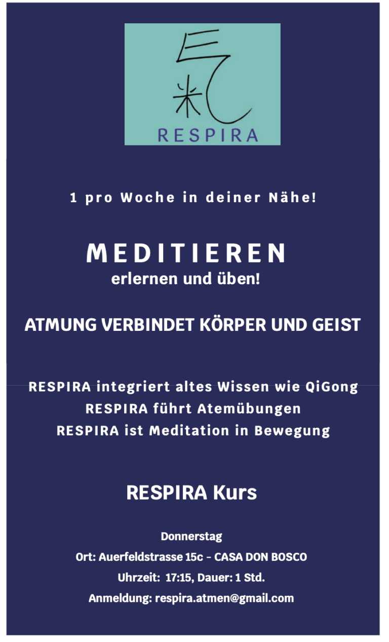RESPIRA sind Atemübungen.  RESPIRA integriert altes Wissen wie Qi-Gong.  RESPIRA ist  Meditation in Bewegung.  RESPIRA ist für jedes Alter empfohlen, für alle die Klarheit brauchen und Ruhe suchen, inspiriert in meinem Meister Dharma.